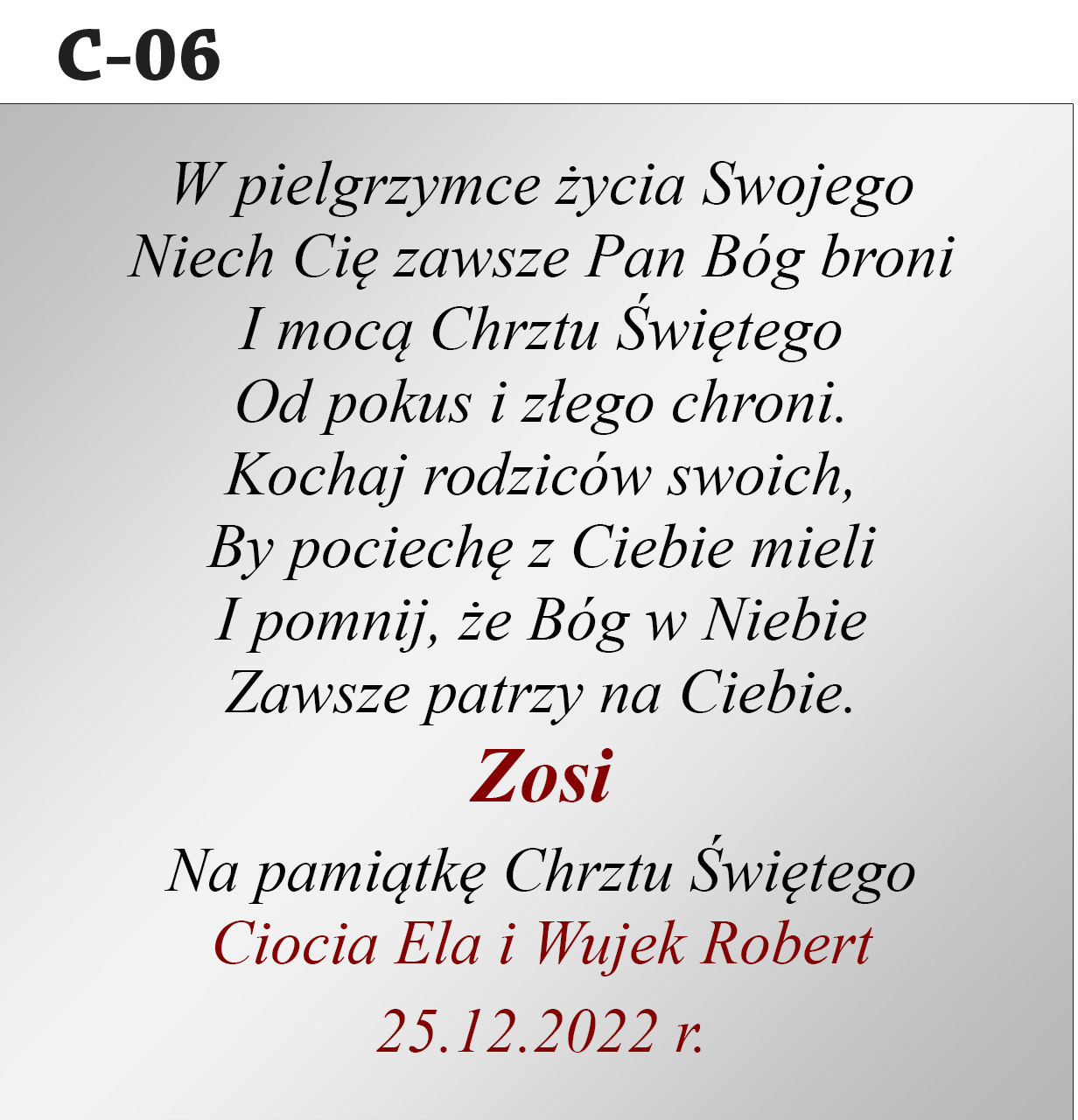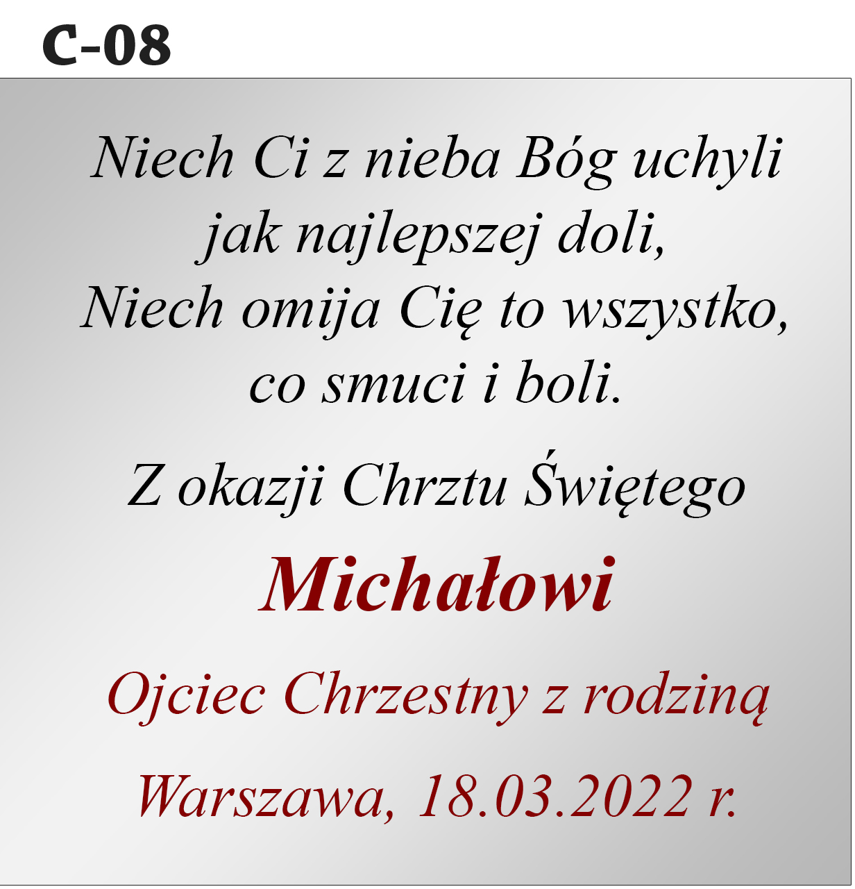 Jeśli korzystasz z naszych wzorów podaj nam nr wybranego wzoru oraz dane do zmiany (zaznaczyliśmy je na czerwono - imię dziecka; od kogo jest pamiątka oraz datę).