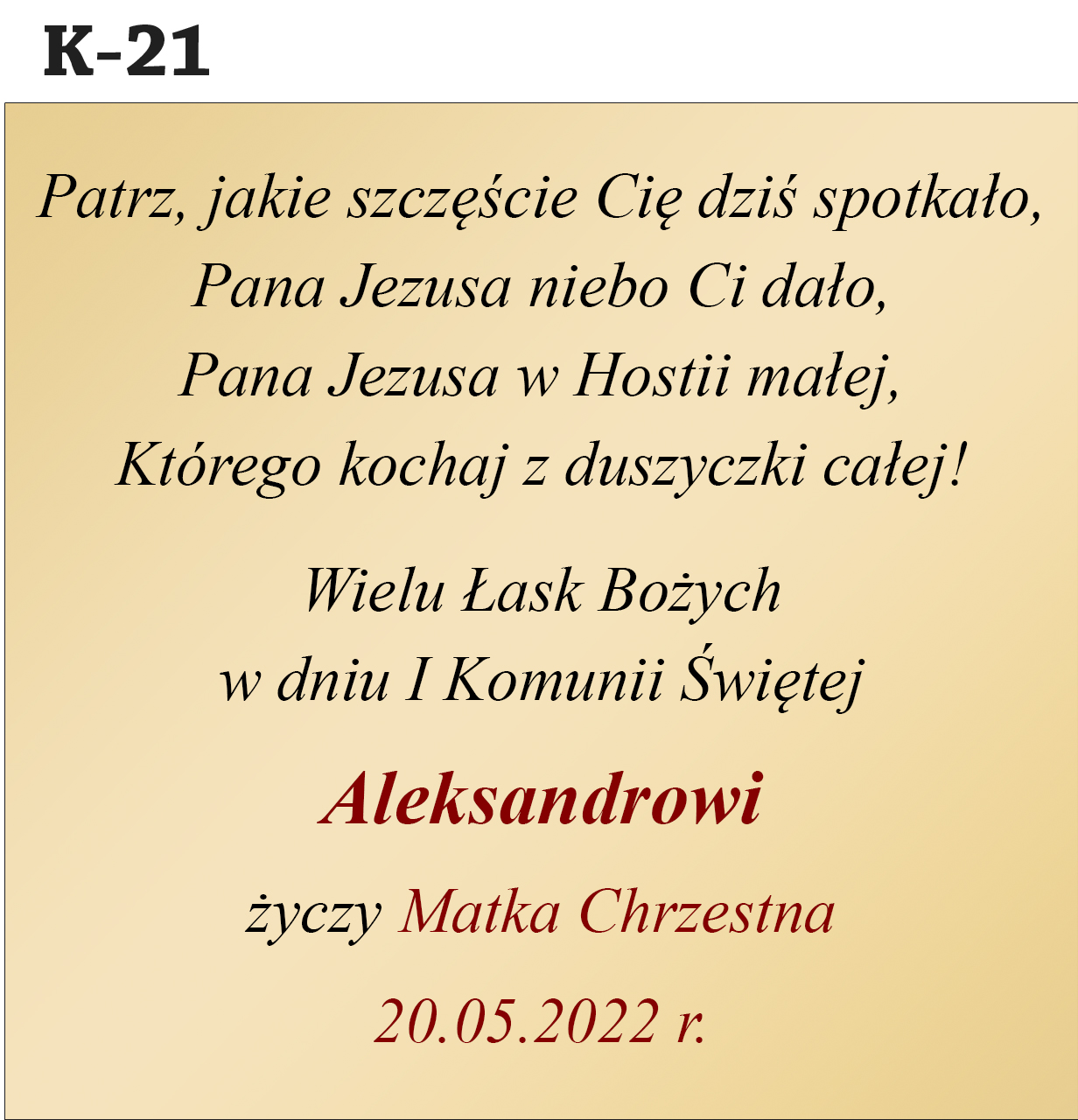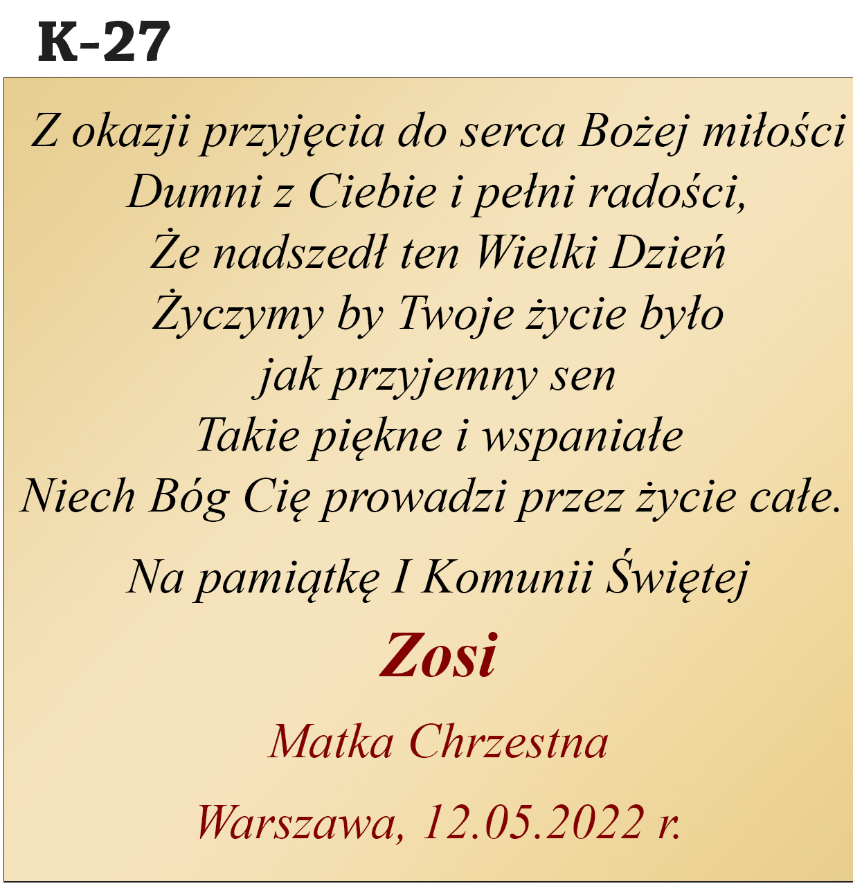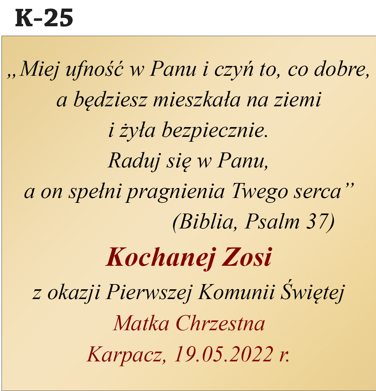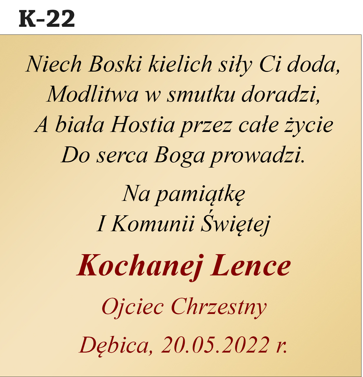 Jak zamówić personalizację? Abyśmy mogli przygotować Twój wyjątkowy prezent, w polu "Personalizacja" podaj treść dedykacji (nr wzoru, imię dziecka, od kogo jest prezent, data uroczystości).