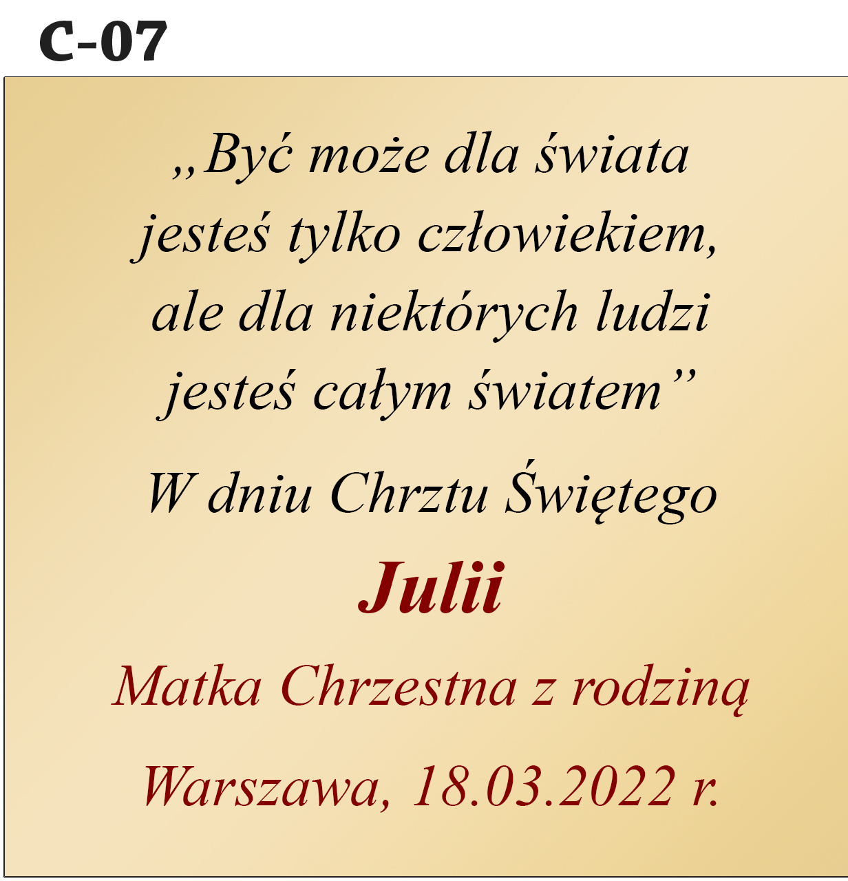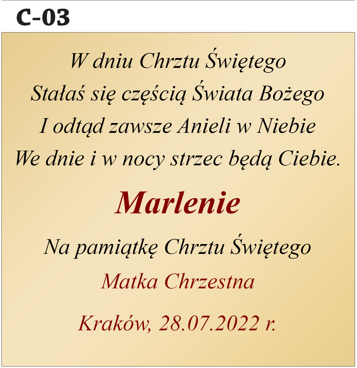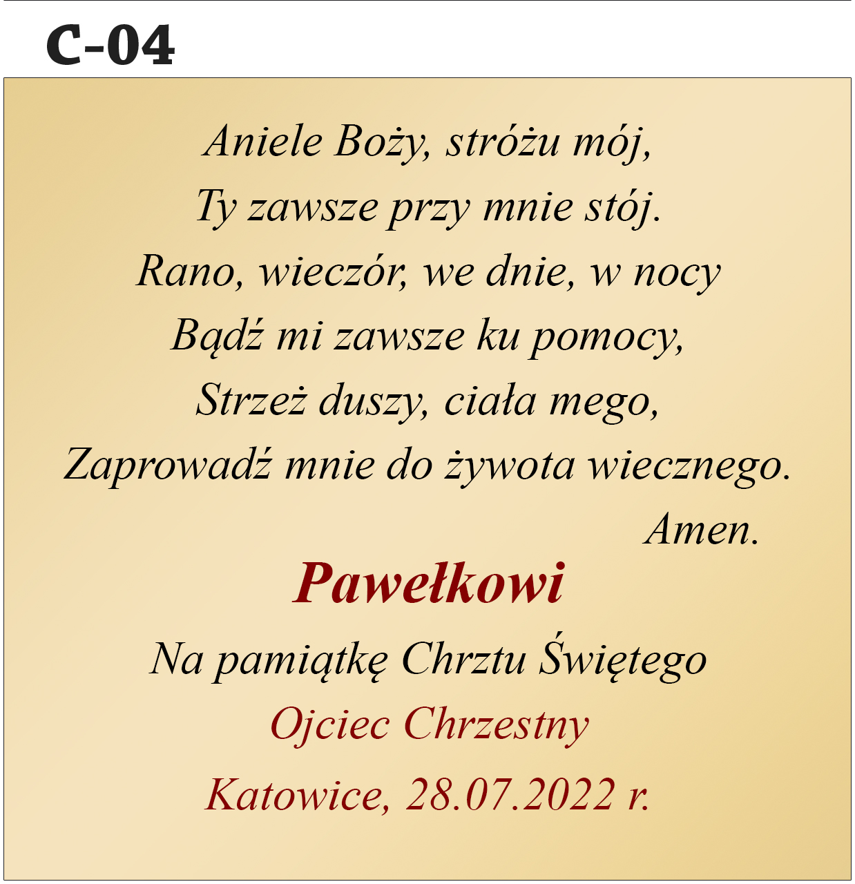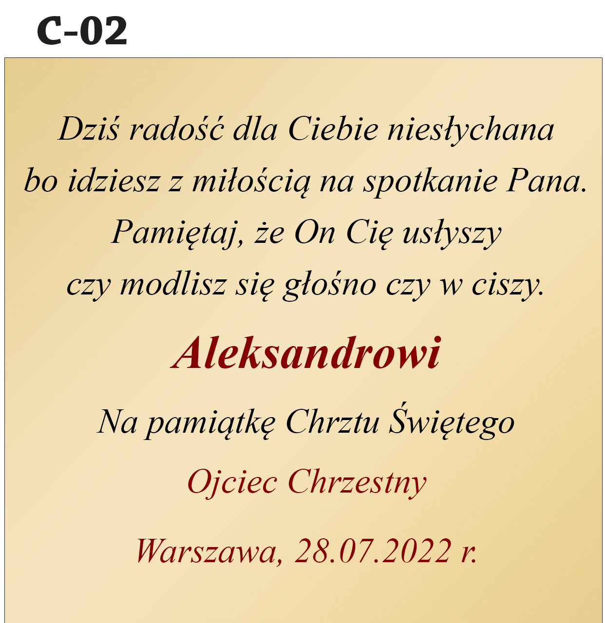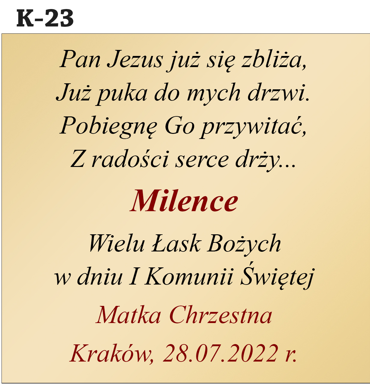Jak zamówić personalizację? Abyśmy mogli przygotować Twój wyjątkowy prezent, w polu "Personalizacja" podaj treść dedykacji (nr wzoru, imię dziecka, od kogo jest prezent, data uroczystości).
