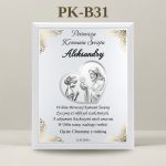 Każdy egzemplarz jest unikatowy dzięki możliwości personalizacji. Na eleganckiej, srebrnej blaszce aluminiowej w tle z delikatnymi ornamentami umieszczamy: